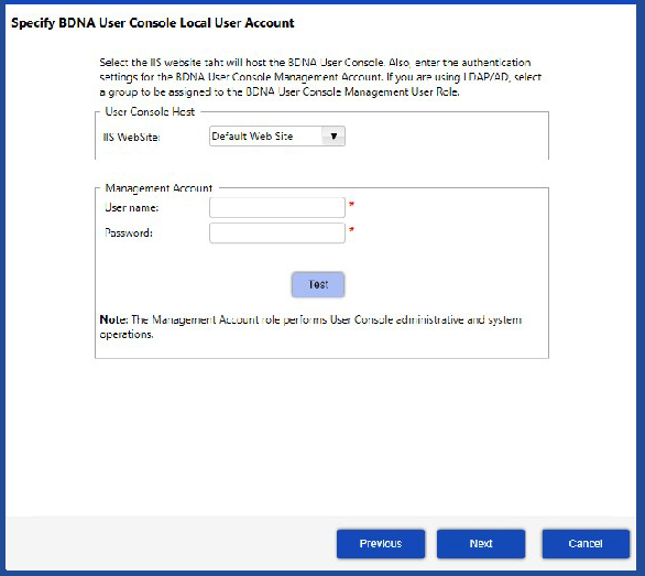 7. Enter the authentication settings ( User name and Password ) for the Data Platform User Console Management Account .