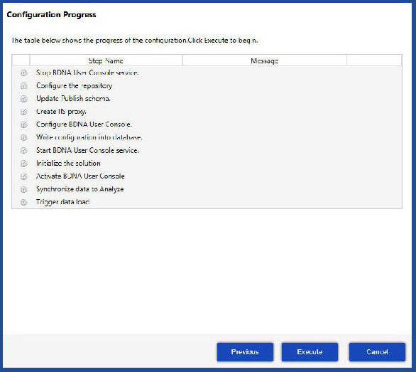 12. Click Execute to begin the configuration process. Messages appear in the message column that provide status details about each step in the process.
